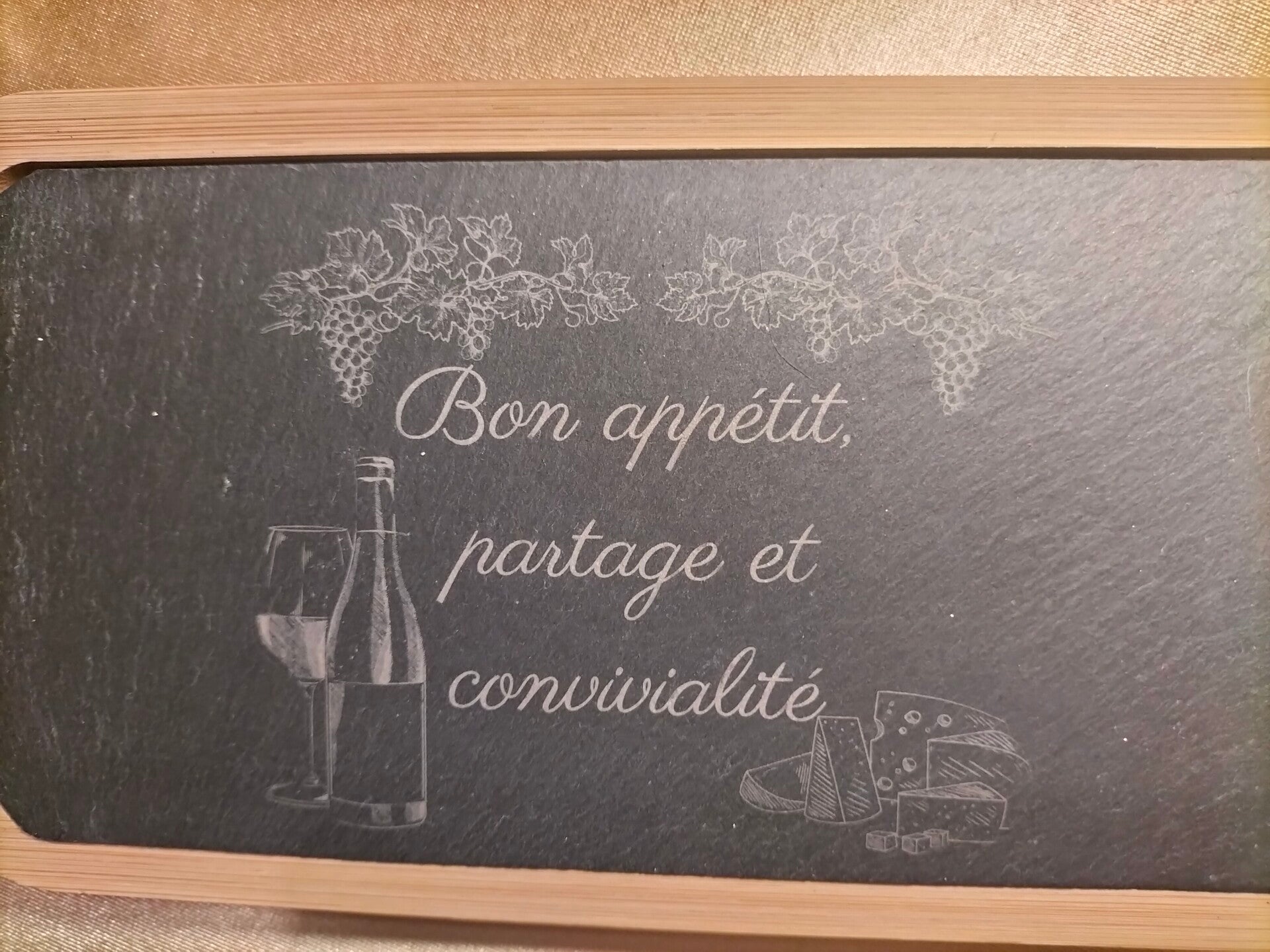 Planchette apéro moitié bois moitié ardoise : dimensions totales 31 cm x 12 cm, avec insert ardoise amovible de 20 cm x 10 cm – Pratique pour le nettoyage, le bois apporte une chaleur naturelle tandis que l'ardoise est idéale pour la gravure.